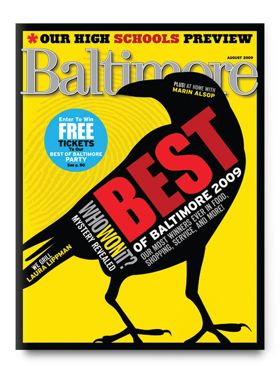 WE WENT FULL EDGAR Allan Poe on the 2009 cover, with a raven and the catch phrase, “WhoWonIt?” (as in “whodunit”). This was the year when a lot of still thriving businesses got nods: Taharka Bros. won “Best Ice Cream,” Dangerously Delicious pies won “Best Pies,” Sassanova won “Best Fancy Shoes,” and Woodberry Kitchen (now Woodberry Tavern) won “Best Hot Spot.” We shot a picture of Oriole centerfielder Adam Jones, holding——what else?——a whipped cream pie and gave him “Best Oriole.” In our Media section we gave nods to the usual suspects——Marianne Banister, Vic Carter, and Tom Tasselmyer, of whom we said, “No one cares about the weather more.” If he didn’t put that on his business card it was a missed opportunity.