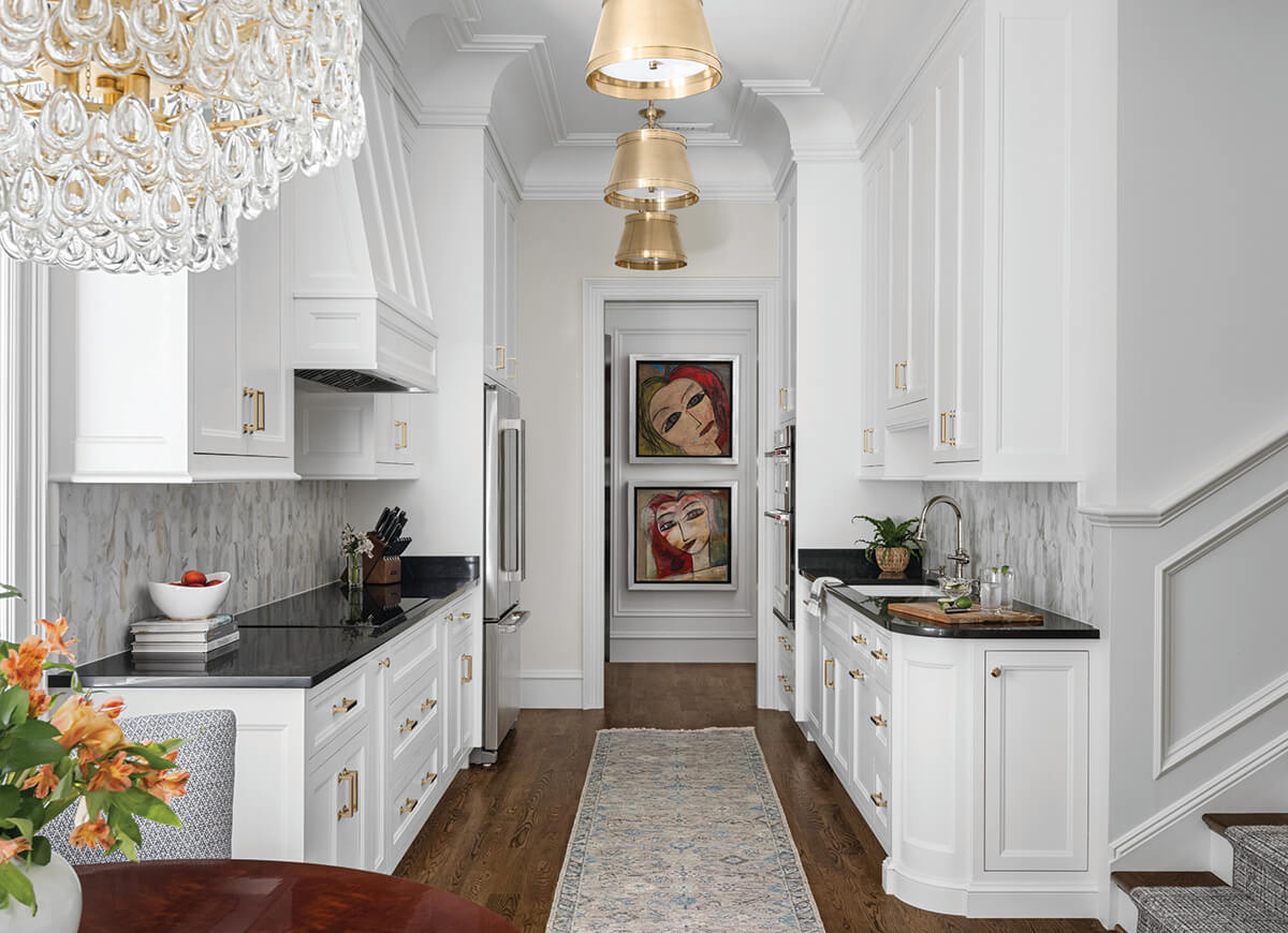 This high-end condominium design by Annapolis-based Melissa McLay Interiors was all about understated opulence, where design elements seamlessly converge to create an ideal living experience. Luxurious fabrics, including velvets, silks, and printed linens, added texture and richness to the space. “This home thoughtfully considered every detail, including line of sight as seen in the view from the dining table through the kitchen to the hallway’s art placement,” says Smith. “One of the many highlights of this home is the millwork details, especially the crown molding, which is done artfully, beautifully transitioning at every corner and room.”