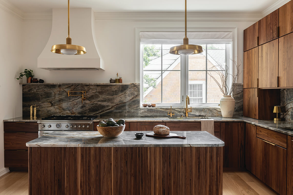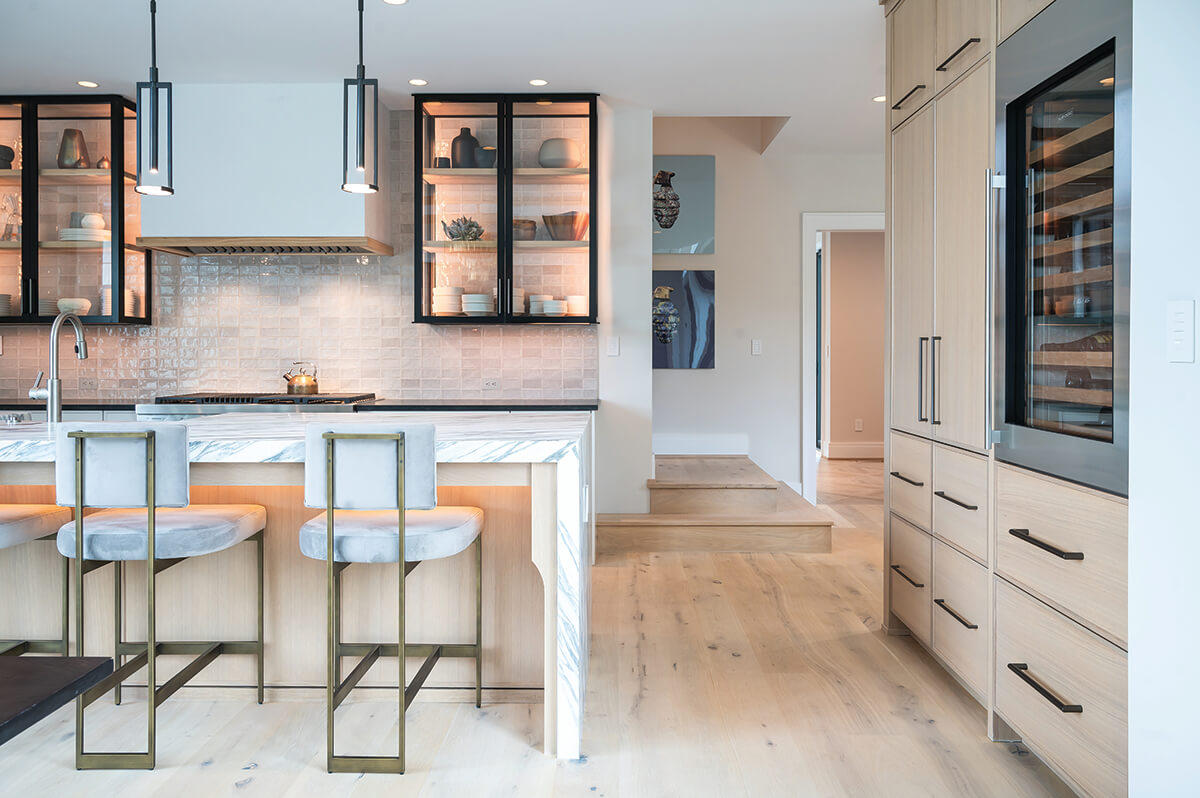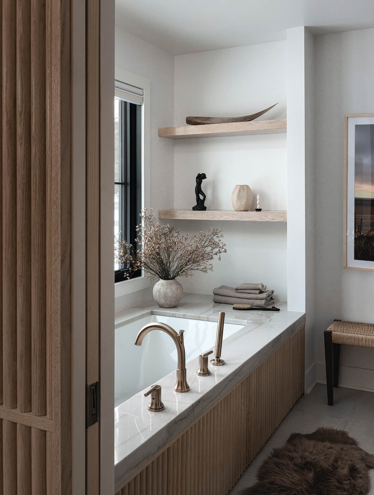 The goal for this primary bath was to create a spa-like ambiance. “There’s a great sense of consistency and softness in the selection of materials,” says Carlson. Pascale de Fouchier Interiors achieved this through tambour paneling that brought texture and warmth. “The walls are lovely and are an appreciated design detail,” says Williams. “I also appreciate the addition of a coffee bar in the main suite but just outside the bathroom.”