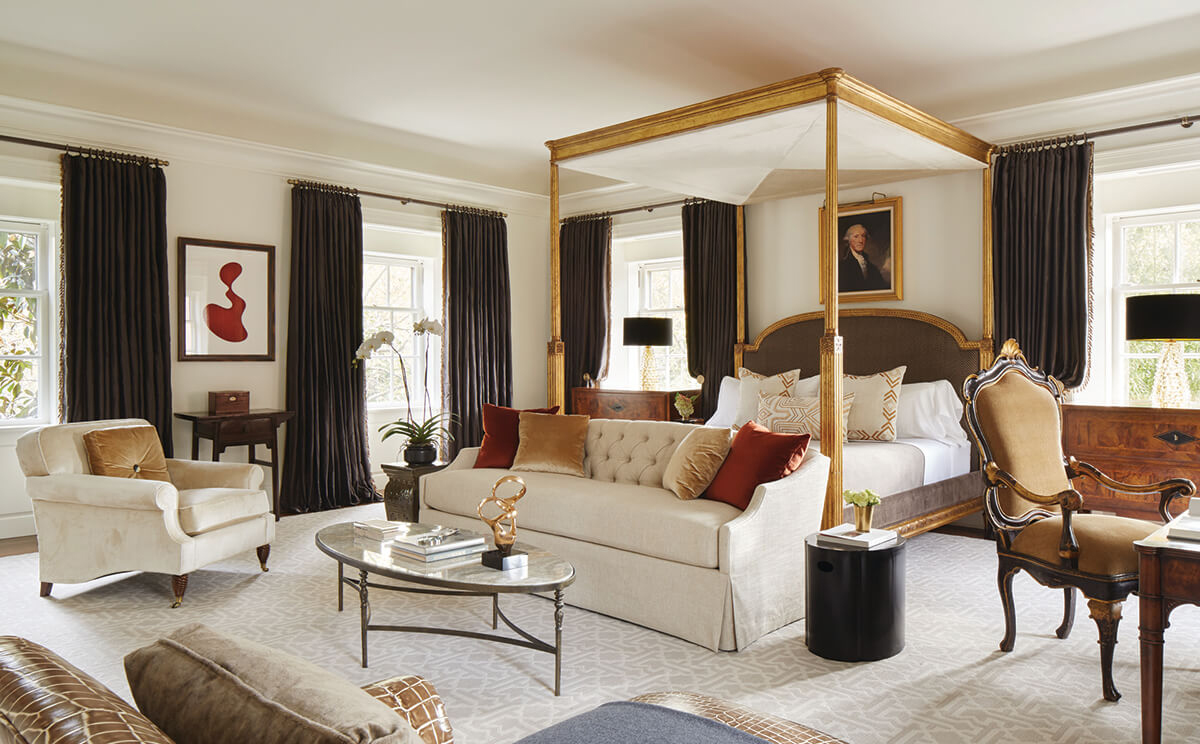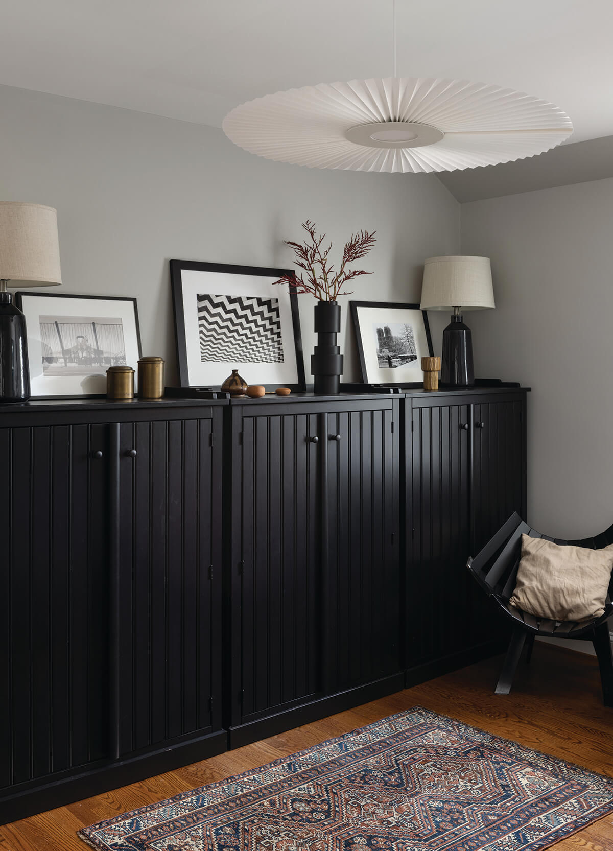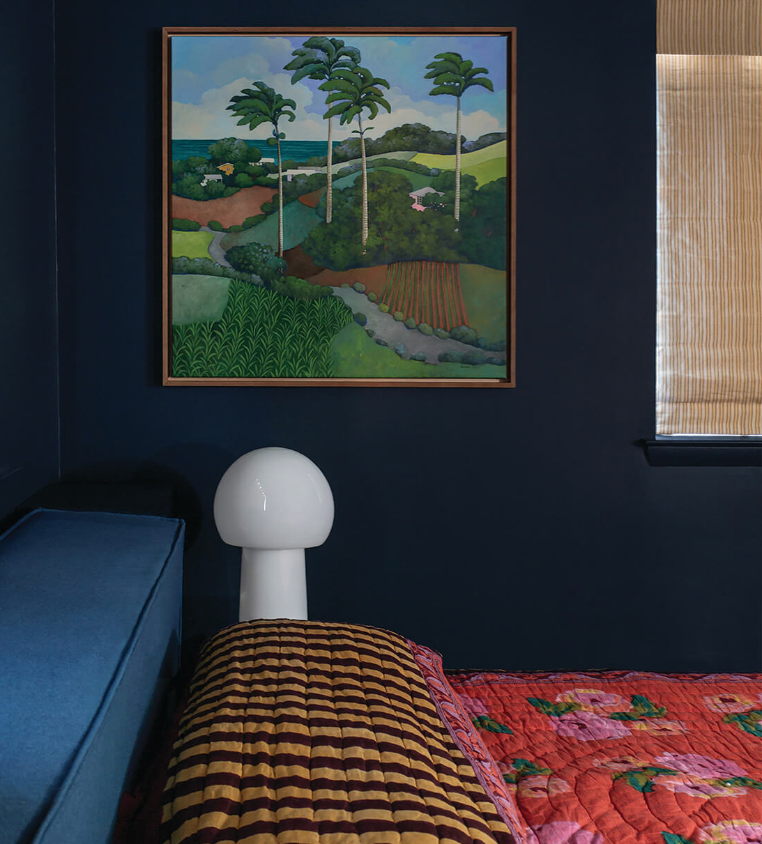 The homeowners wanted a space that felt different from the rest of the house—cozy for sleeping in on the weekends or staying up late and reading in the evenings. They wanted it to feel adult and beautiful. Surrounded By Color started with a very rich dark blue color and then layered brightness overtop with an Italian bedspread by Lisa Corti, a Noguchi floor lamp, ticker stripe window treatments, and an interesting rug. “Use of color and creation of moody interior pushes this to design excellence,” says Carlson.