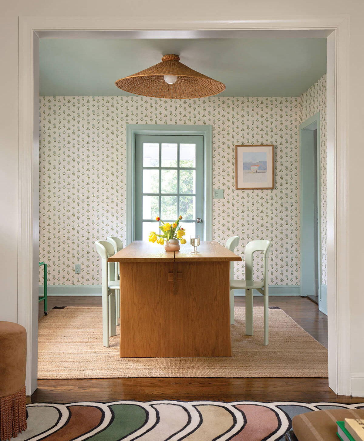 Surrounded By Color transformed a very small and not functional dining room into a bright and colorful space with a new table, painted floral paper, and one of their favorite light blue paints by Backdrop on the ceiling. The oversized wicker light helps ground the room and add texture. “I can appreciate the color story and spatial planning for this small dining room,” says Williams. “It appears larger than it is.”