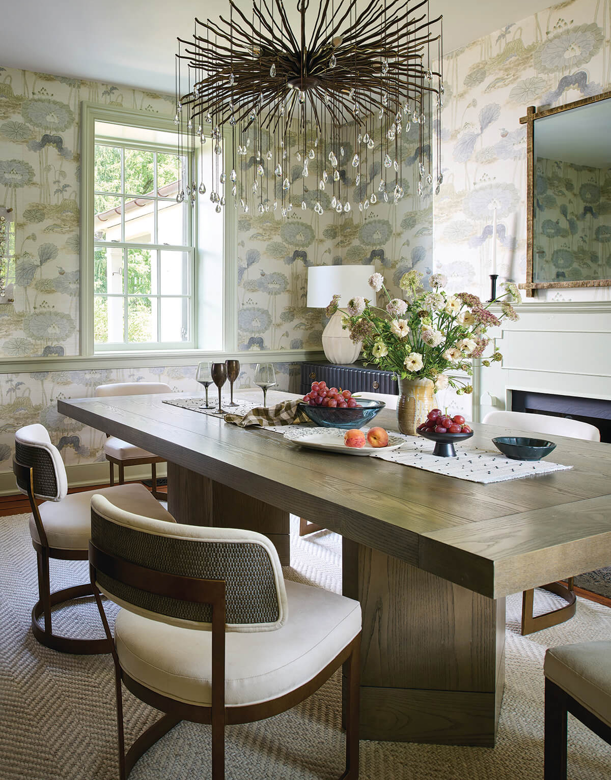 Constructed in 1904, this Colonial-Revival Roland Park house was originally built for Daniel Willard, president of the Baltimore and Ohio Railroad from 1910 to 1941, and was in desperate need of a major restoration/revitalization. Baltimorebased APEX Builders were tasked with balancing the client’s needs—which included touches of color—with highlighting the original architectural details in “Uncle Dan’s” house. “The millwork and staircase are exquisite,” says Williams. Smith agrees: “The home is made memorable because of the use of both pattern and color. The wallpaper selections feel true to the home but with a fresher lens, and the blue millwork in the dining room is such a breath of fresh air.”