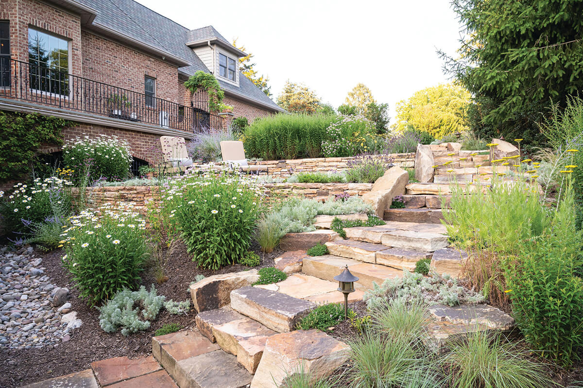 Glen Arm-based Pinehurst Landscape Company transformed this neglected small side yard in Cockeysville into a nostalgic sitting and cutting garden. The sunny and dry hillside called for native meadow plantings which provided color and privacy. Pinehurst used laurel mountain stone for the wall, boulder, and step material because of its ability to complement the brick facade, and utilized the original stone steps on the hillside, reenforcing their original place and purpose.