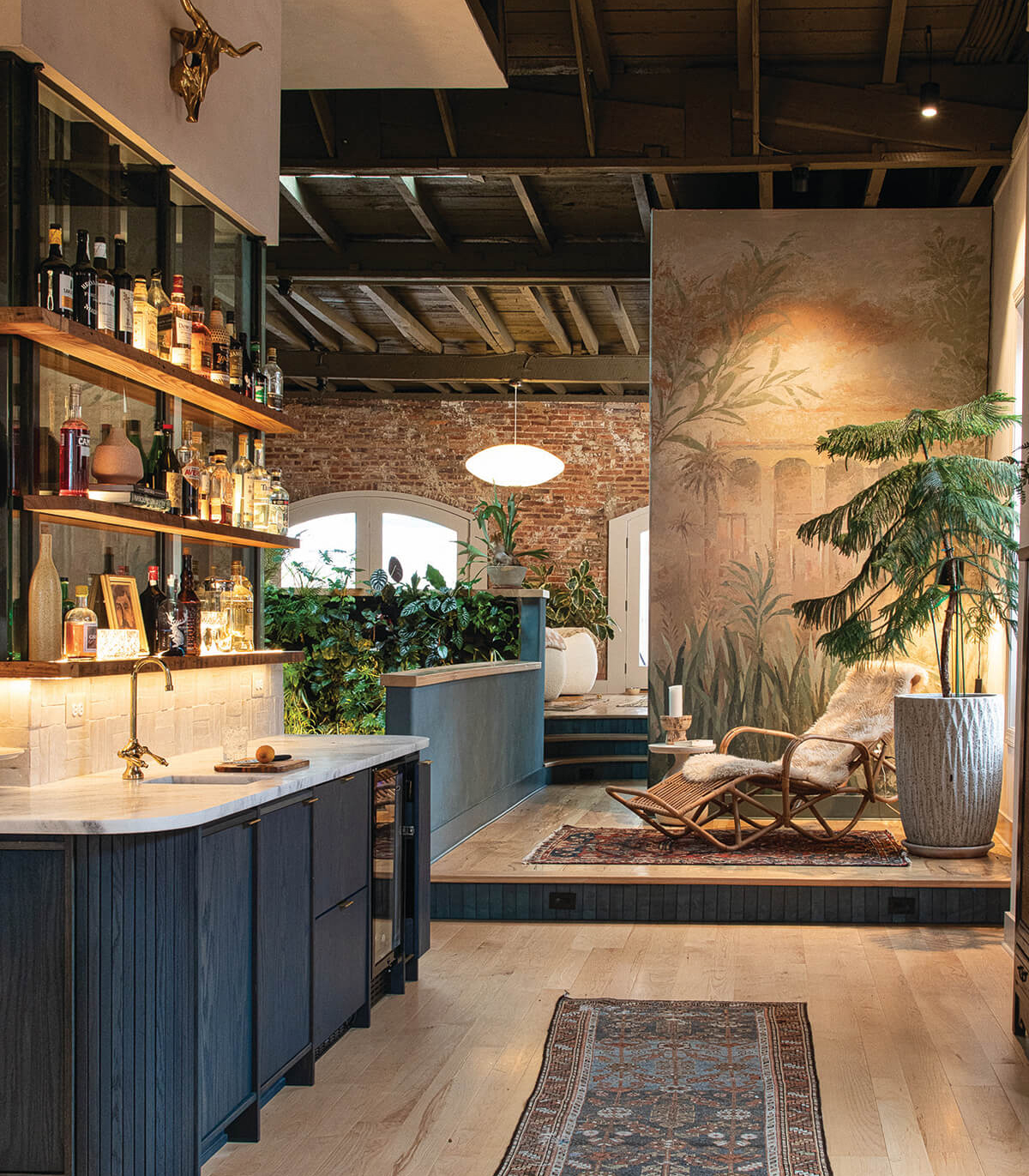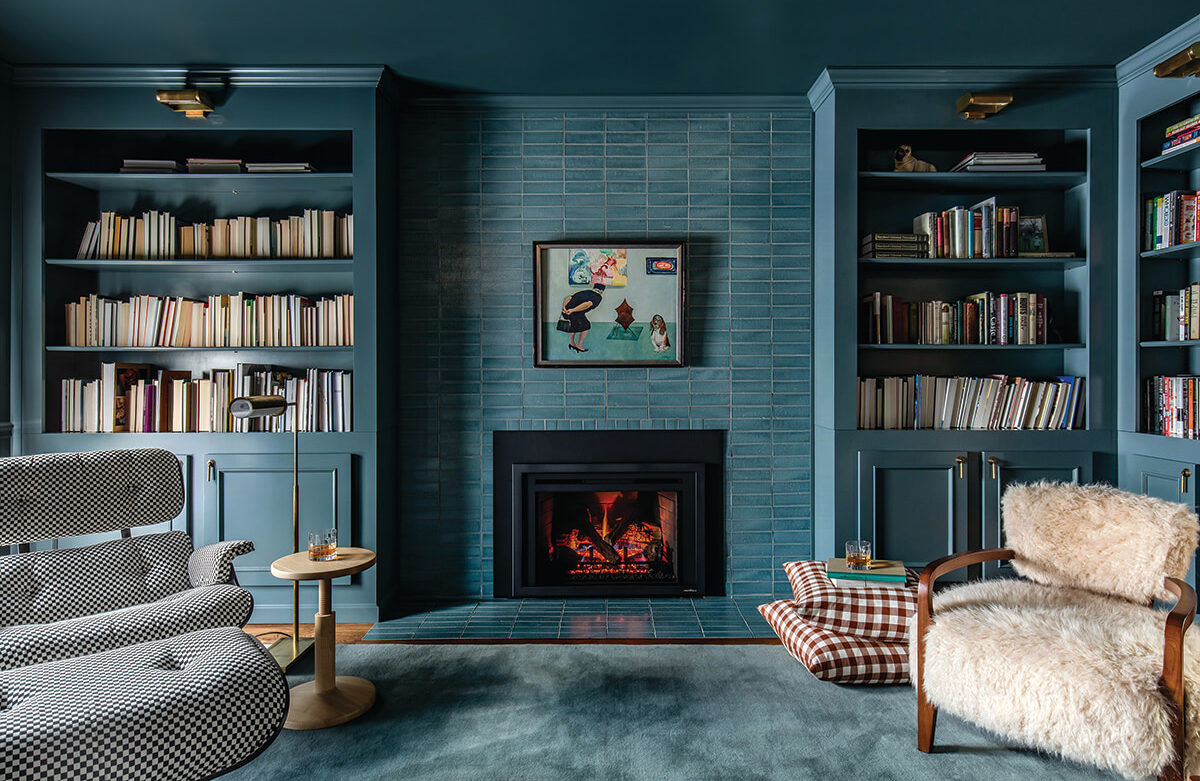 When clients purchased a traditional home in Cockeysville, they tasked Baltimore-based Surrounded By Color with creating a home office with a midcentury modern vibe. They drenched the entire room in the same colorway and clad the fireplace wall in glazed brick. “It’s a great use of color-washing and color choice,” says Williams. “Sophisticated yet fun and cozy.” Smith agrees. “The monochromatic flavor of the blue ceiling, walls, and custom bookshelves mixed with blue tile and blue area rug struck me,” she says. “The use of the checkered chair and pillows in varying scales, and in other colorways, creates additional visual interest.”