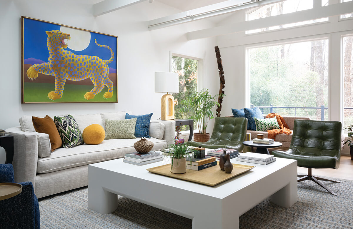 Redhead Design, a Baltimore-based interior design firm, envisioned the expansive living room as a gallery-like space to celebrate their client’s vibrant art collection. The stunning painting, “Jaguar in the Moonlight,” takes center stage, inspiring a rich, jewel-toned palette. “I love the connection of the art to the use of color,” says Carlson. The artwork shines, while luxurious textures—velvet, leather, and linen—add depth and warmth. “It’s a sophisticated and exuberant use of furniture, decor, and artwork,” says Williams.