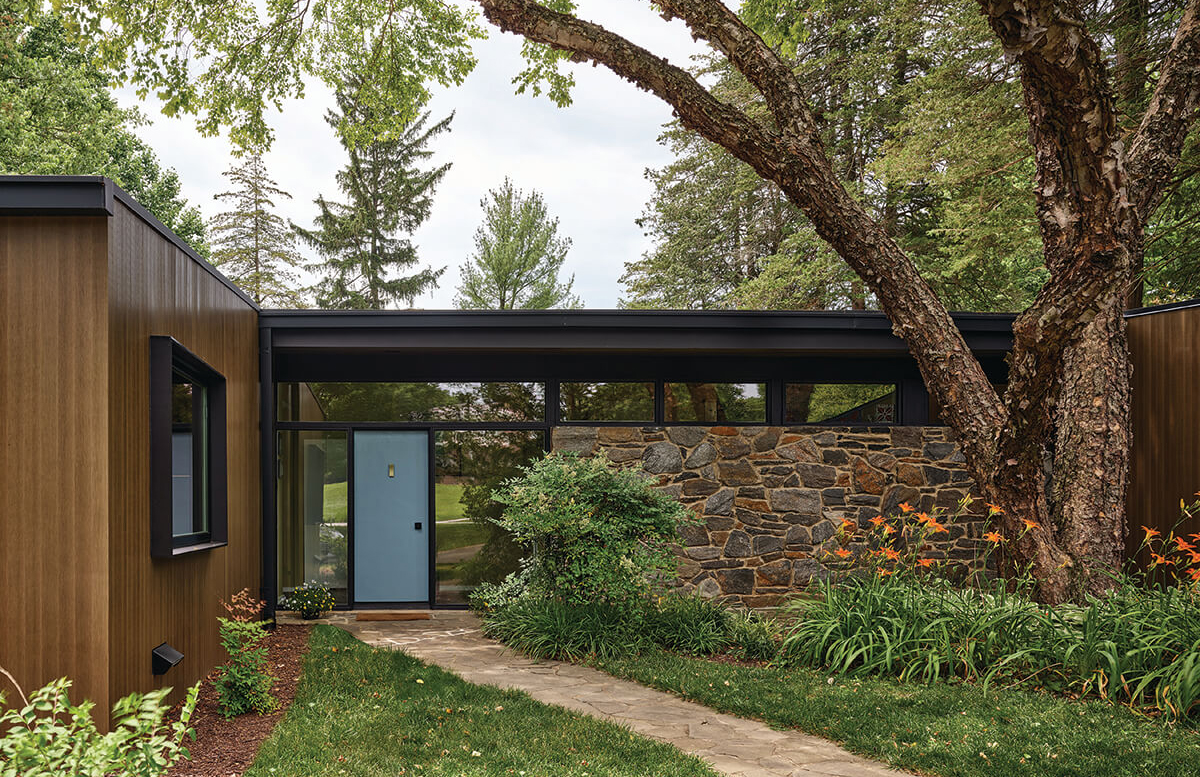 This three-bedroom, two-bath house was originally designed in 1956 by the New York-based modernist architect William Landsberg. Place architecture:design was brought in to restore it to its original character. “The use of natural materials like slate and walnut, as well as preservation details like the vertical cedar siding, makes this home a true gem,” says Williams. Judge Beth Diana Smith, CEO and principal designer of Beth Diana Smith Interiors, agrees: “There’s a lot to love about this renovation, especially the larger windows for exterior views that bring more of the outdoors in. The color palette in both the interior and exterior is beautifully aligned with midcentury modern and feels organic and fresh.”
