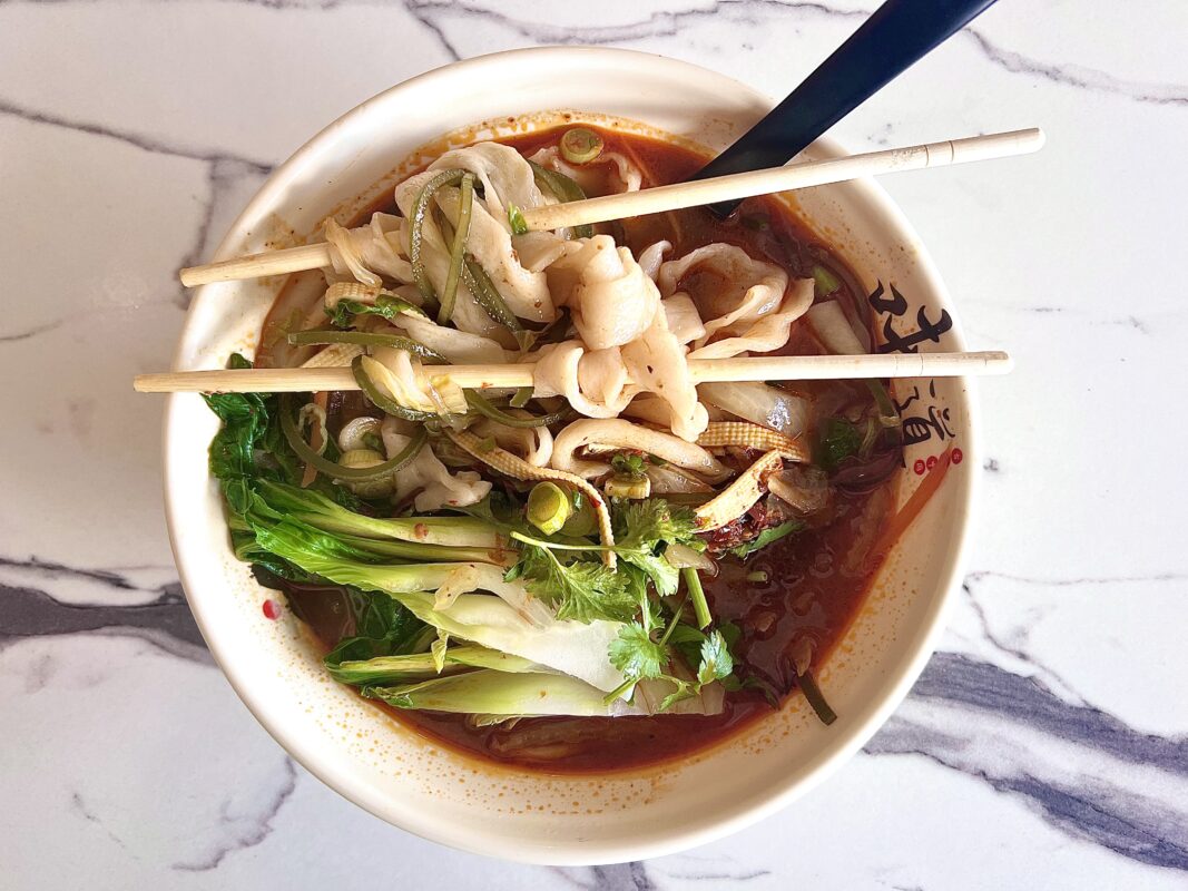 Or you can order the noodles in a spicy vegetable version, which comes out happily heat-charged, the vermillion-tinged broth enveloping a tangle of noodles, bok choy, cabbage, and fine threads of carrots, tofu skin, and seaweed. The spicy version wasn’t on the menu originally, but was added to appease chile-heads. And it is quite spicy, as one of the women helming the counter warned me. (She’s from Chengdu, and approved the recipe.)