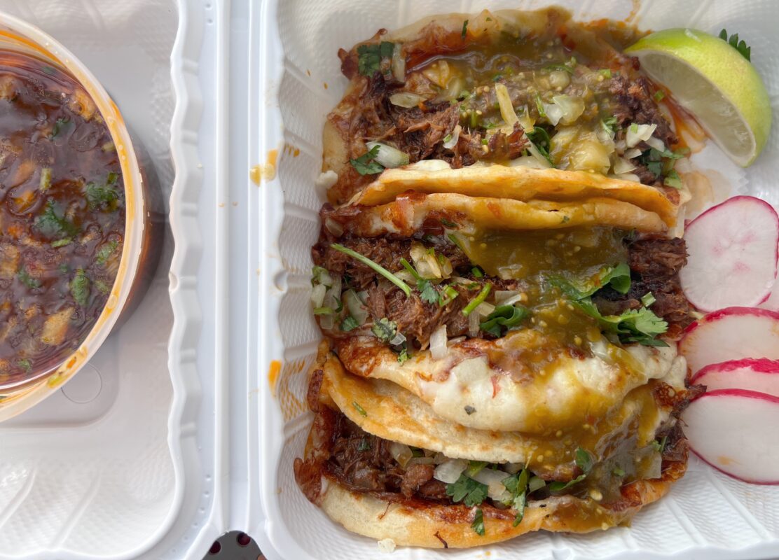 Quesabirria tacos—tortillas topped with melted cheese, folded around birria, and accompanied by a cup of consomé for dipping—are hearty, blissful items. They’re usually constructed with pre-made, purchased tortillas because it’s easier, cheaper, and the factory tortillas crisp up better. But they’re stunning when built with just-made tortillas, though admittedly messier. Your order will come with three tacos and a cup of broth, as well as radishes, lime, and a little knotted bag of hot sauce, should you require more heat.