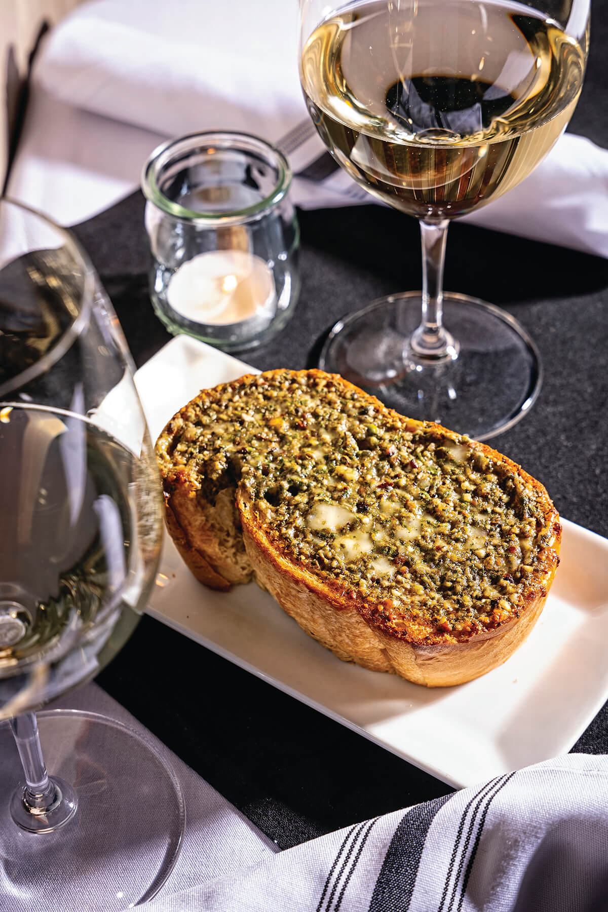 Take, for instance, one of her weekly hand-written menus from this past June—number 1,308—which encouraged diners to not only “be well” and “tip well” but “floss daily,” too. A “bump” of caviar could be ordered alongside fresh oysters on the half-shell, accompanied by mini bottles of Tabasco. There was also chicken liver pâtè in a crystal jar and Low Country shrimp and grits on blue-and-white china. Every meal must begin with the signature house salad and, of course, the garlic bread—a thick Italian slice topped with an almost indecent slather of alliums, herbs, and Gorgonzola that is reason enough to visit. Meanwhile, the long-loved filet mignon, topped with “100% pure butter,” could be a final supper.