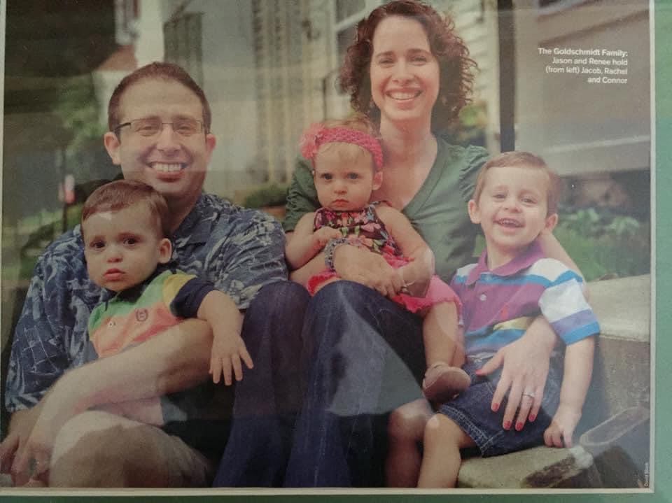There’s a photograph in front of her townhouse taken for The Jewish Times (about her micro preemies) that has a face—almost Friday the 13th-esque or a goblin (or maybe it’s just a rock) reflected in the window behind her beautiful family.