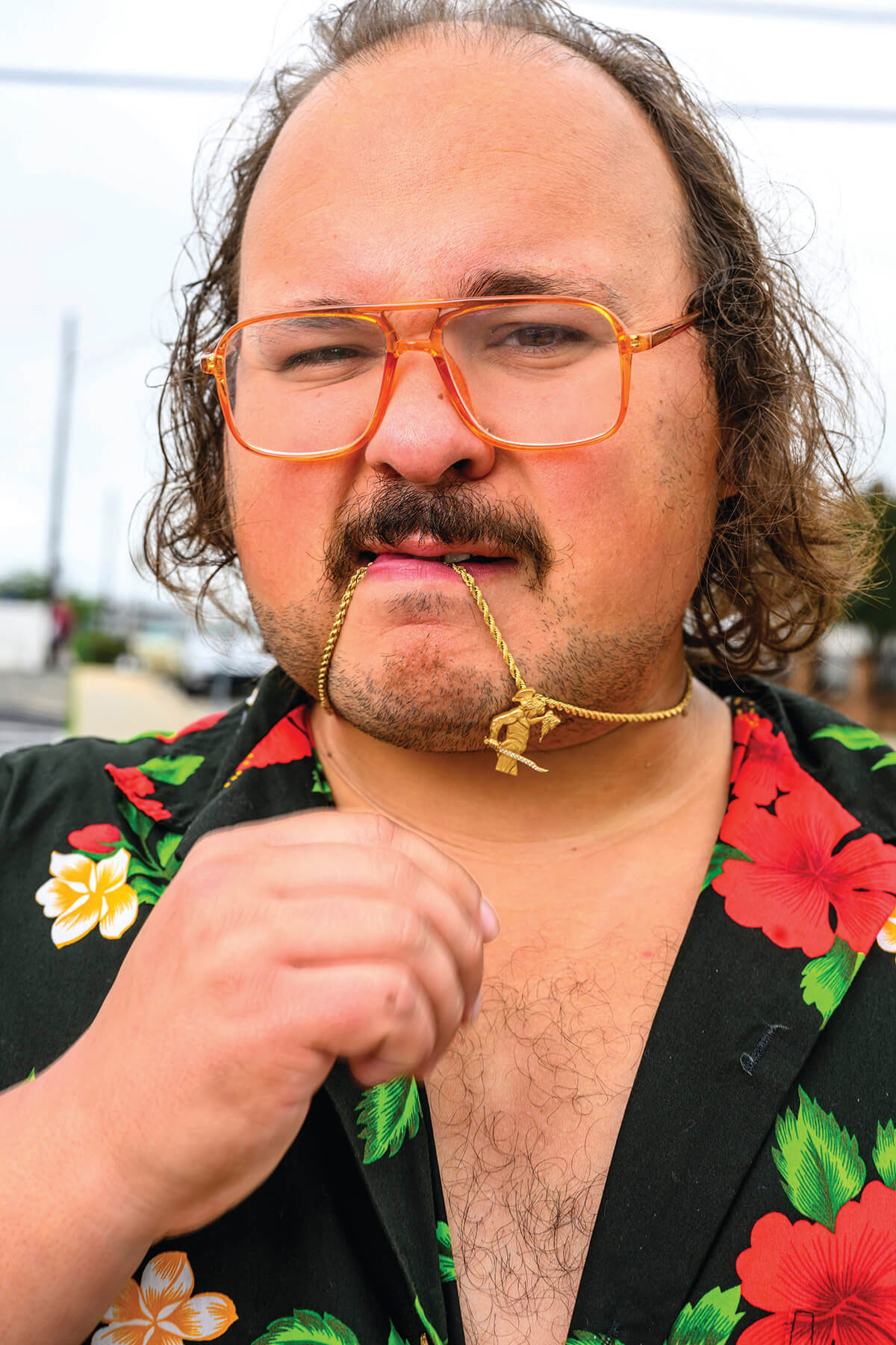 The dreamboat in question is characteristically dressed down, wearing shorts, a half-buttoned, blue-floral Hawaiian shirt, and large ’70s-style eyeglasses that sit low on his nose. A chain with a pendant of the Greek hero Perseus holding the head of Medusa dangles from his neck. He seems, on this mid-May Tuesday, either really relaxed or utterly exhausted—which would be understandable, considering he’s just wrapped up 60 stand-up comedy shows at 45 venues in 80 days.