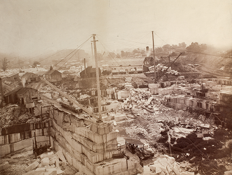 By the turn of the 20th century, as Baltimore reached an industrial heyday and experienced a related housing boom, hundreds of laborers were mining the quarry for its marble—first by hand, then using steam-powered machinery—with thousands of tons hauled out each day, hoisted onto ox-pulled wagons, then heaved down the railroads to the dozens of marble purveyors in city limits.