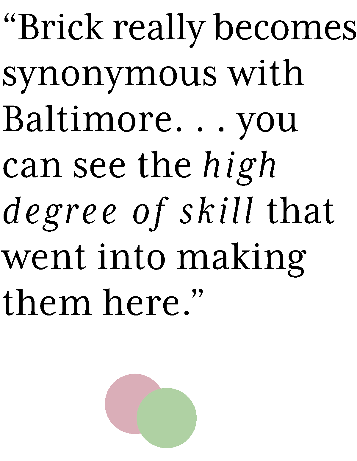 Of course, many major American cities built with brick, but the material “really becomes synonymous with Baltimore,” says Gleason. “This was a great epicenter of brick manufacturing, and from early on, you can see the high degree of skill that went into making it here.”