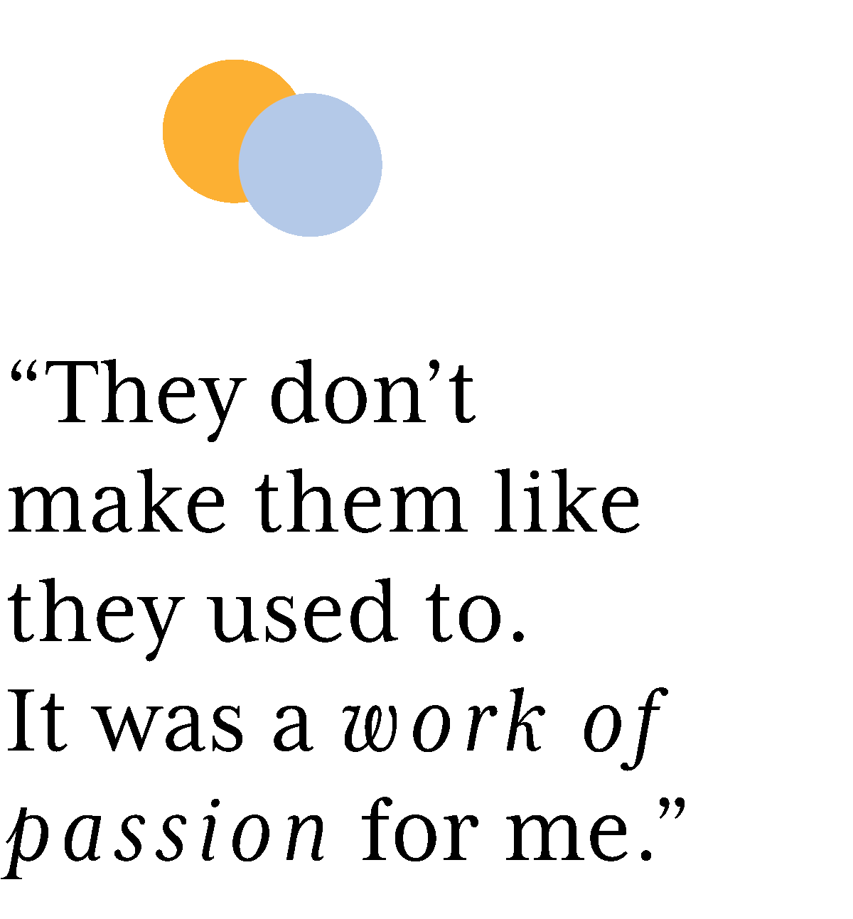 “Everything now is done fast and cheap,” he says. “It’s harder to renovate than build new—nothing’s square, nothing’s plumb. But they don’t make them like they used to. It was a work of passion for me.”