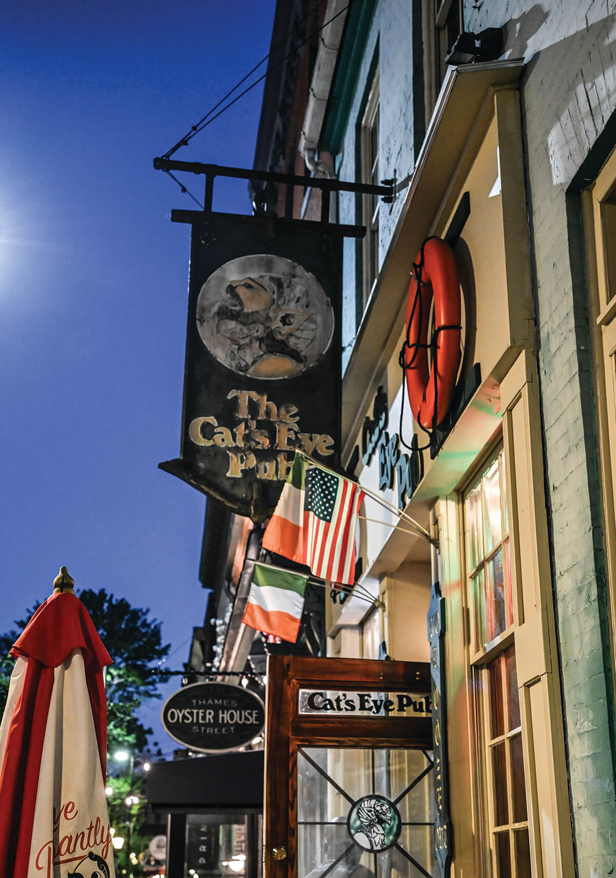 On weekends, you can often find “Bowtie” Bob Nelson bopping about, too. Many Sundays, and every St. Patrick’s Day, he attends Mass, then makes his way to Thames Street for his usual: a pint of Guinness and a Jameson, neat. He knows there’s been an influx of fancy restaurants and cocktail lounges around the neighborhood lately, but he likes the lack of pretension in this pub, where anyone and everyone can cut a rug, and the “only gourmet decision to make is if you get the plain or barbecue Utz.”