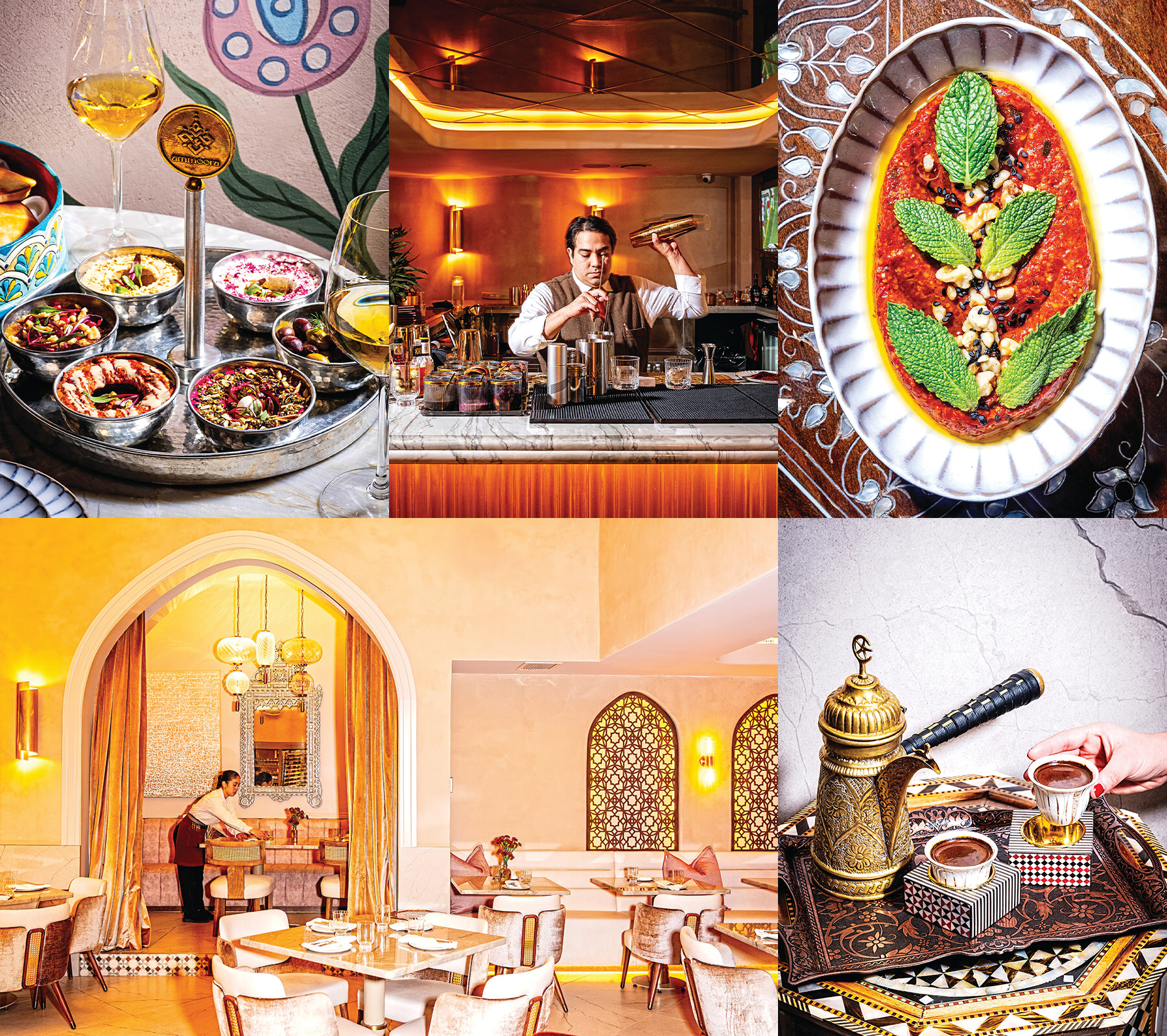 Kebbeh: This national dish of Syria is a standard menu item in Middle Eastern restaurants. What’s not standard is Ammoora’s kebbeh Orfaliyeh, a finely ground paste of raw beef and bulghur, torqued with chile paste, walnuts, and olive oil. The design: Ammoora is gorgeously designed to highlight Syrian furniture imported from Damascus, featuring mother-of-pearl inlay in geometric patterns inspired by Islamic art. Intricate mosaic tile also accents key areas, like the open-kitchen corridor leading from bar to dining room.