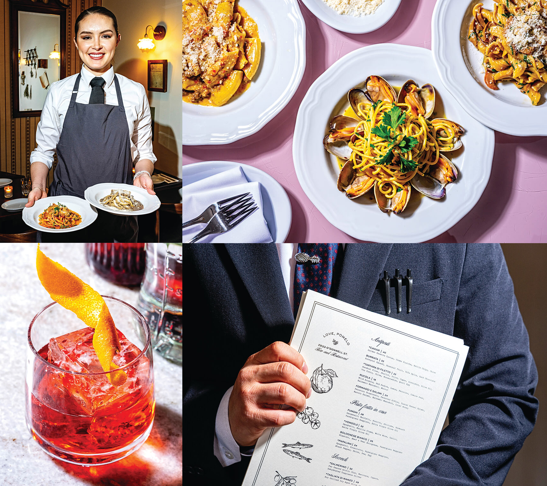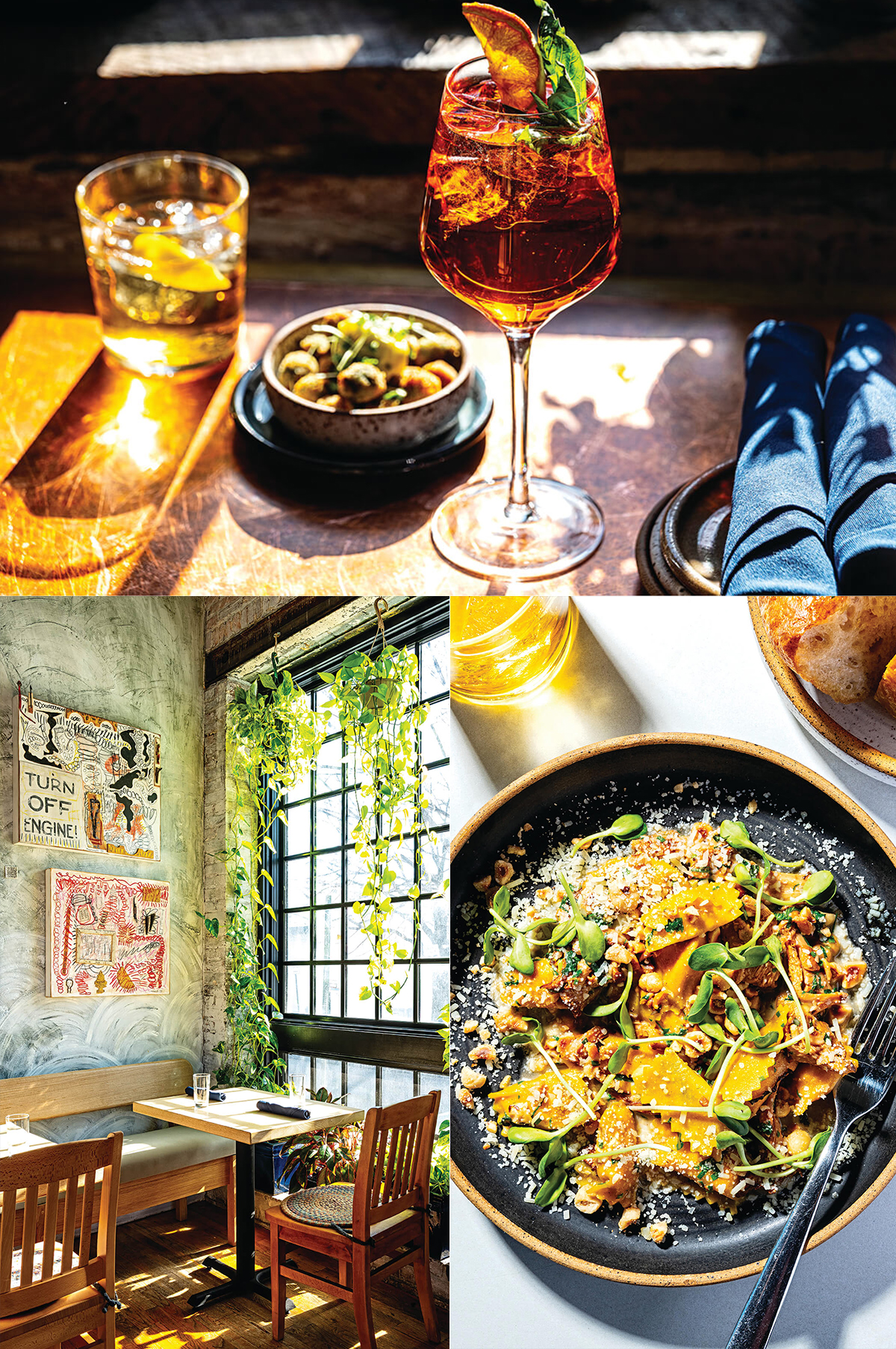 Above: Row 1, from left: Preparing pasta and a negroni at Love, Pomelo; server at Dylan’s. Row 2: Preparing for service at Ammoora; the ravioli at Costiera; menu at Love, Pomelo. Row 3: Dinner is served at Rooted Rotisserie; décor at Costiera; flounder at Dylan’s.